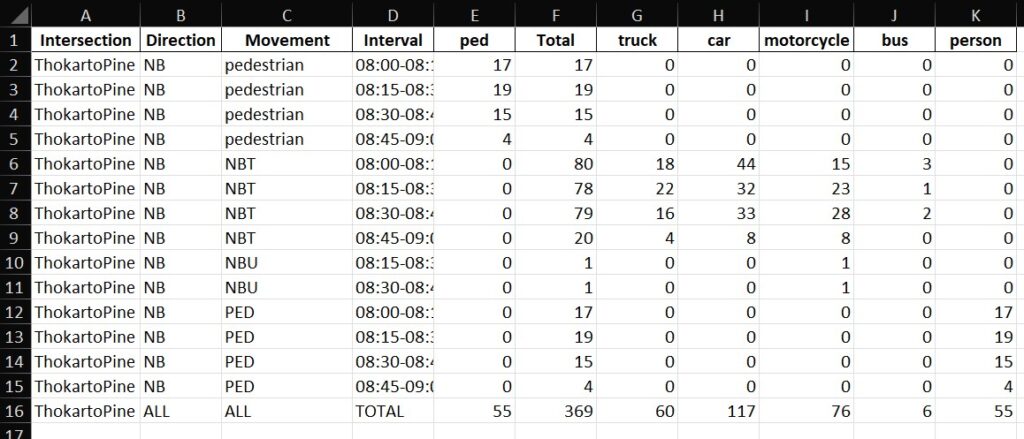 - Each movement (e.g., NBL, NBT, NBR, etc.) is logged with corresponding timestamps and vehicle classifications.