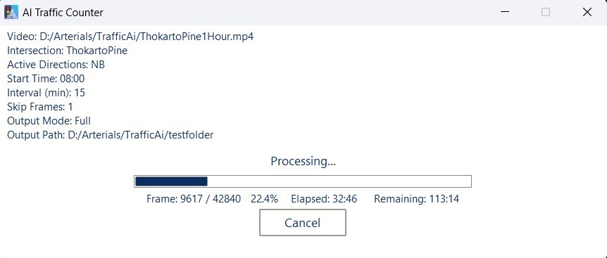 Once processing completes, Arterials AI Traffic Counter automatically generates both annotated videos and Excel reports in your specified output folder. These outputs help you visually verify detection quality and review the final traffic counts in structured form.